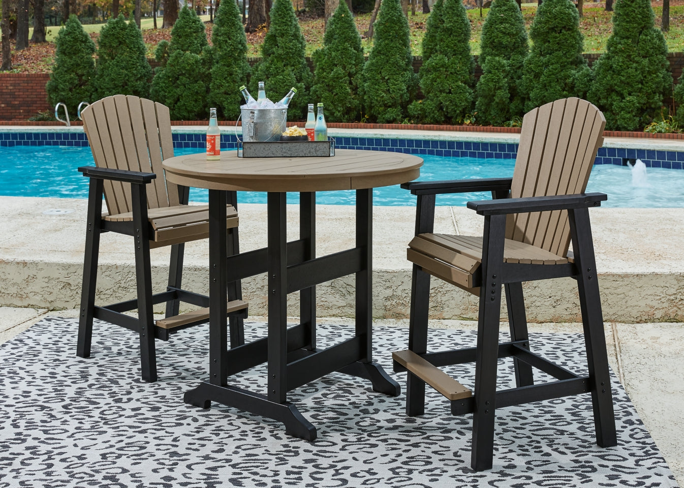 Raise the bar on outdoor living with this round bar table and bar stool set. Crafted for style, comfort and durability, the set impresses with a standout two-tone finish that pairs a light driftwood-look and black finish for twice the interest. Round table design keeps everyone in the flow of conversation, while the stools cater with sturdy armrests, an ample footrest, high shell back and waterfall wrapped seat for curvaceous comfort.