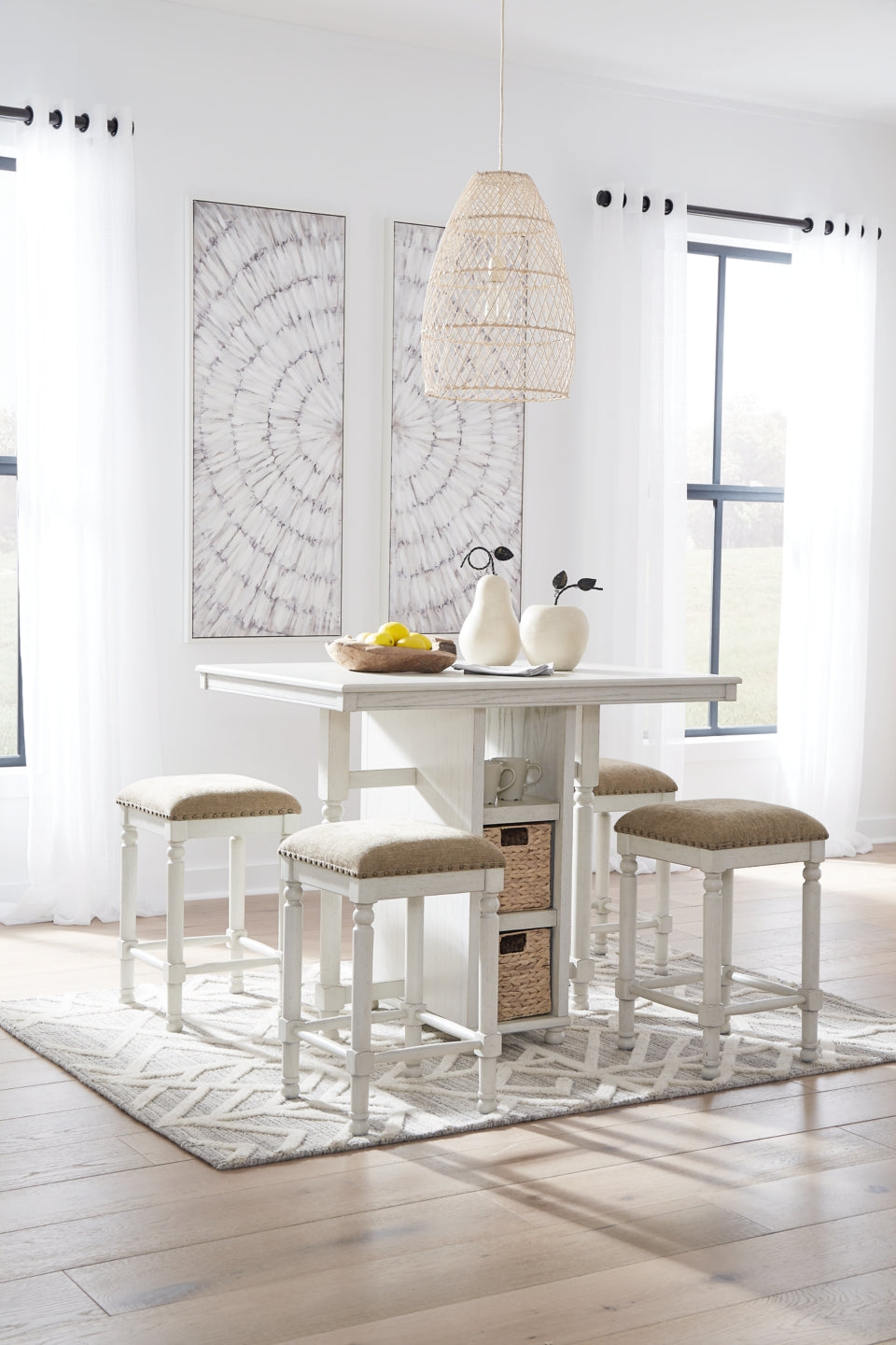 This counter table set adds an irresistible charm to your dining area. An antiqued white finish masters the art of simplicity. Stools with tan upholstery tuck neatly under the table when not in use, saving space in style. The table doubles as a storage solution, with four included woven storage baskets that slide into cubbies for easy access to linens, coasters and other dining essentials.