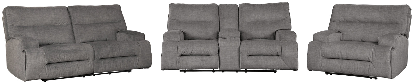 This dual-sided reclining sofa, double reclining loveseat with console, and wide seat recliner set makes it hip to be square. Brilliantly boxy profile and wide track arms infuse a highly contemporary look you don’t often find in reclining furniture. Rest assured, the trendy charcoal-tone upholstery is sumptuously soft—and made all the more enticing with deep channel tufting for clean-lined flair. Dual cup holders and storage in the center console of the loveseat are a mighty handy touch.