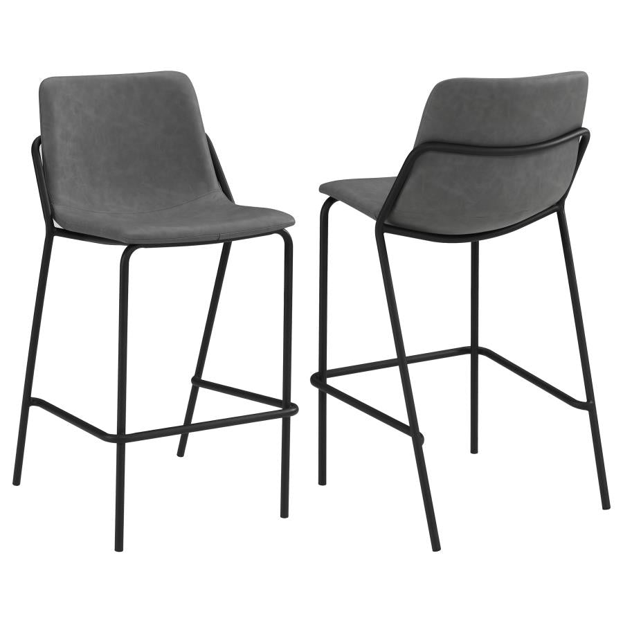 This pair of two stools offer a minimal look and a contemporary vibe. Supported by thin and tall frame in a black finish, it has an open and airy design that works with many styles. Each chair has a bucket style, Mid Century inspired seat, which is wrapped in a leatherette that is easy to clean and soft to the touch. In addition, each stool offers a supportive footrest run between the two front legs. Add a pair of these stools to a home bar for entertaining.