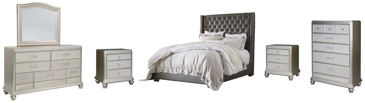 Coralayne Queen Upholstered Bed with Mirrored Dresser, Chest and 2 Nightstands - PKG007776