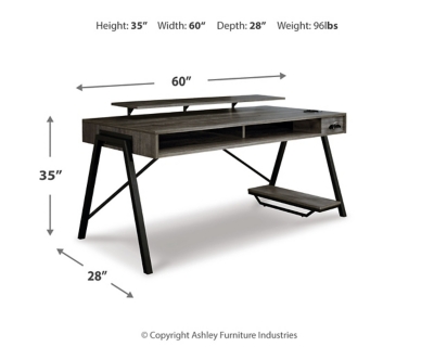 Elevate your style and up your game with this ultra-cool gaming desk. Clean and contemporary, the mixed-media designer desk includes a metal frame in a gunmetal finish, topped with an engineered wood surface with replicated wood grain. Setting you up for success: a large open raceway for power cord management, a desktop monitor shelf, and an LED back light with multiple color options for an enhanced gaming experience. Along with a PC stand for easy access, this gaming desk features a custom designed headset hanger and a built-in electric can cooler with a USB plug-in.
