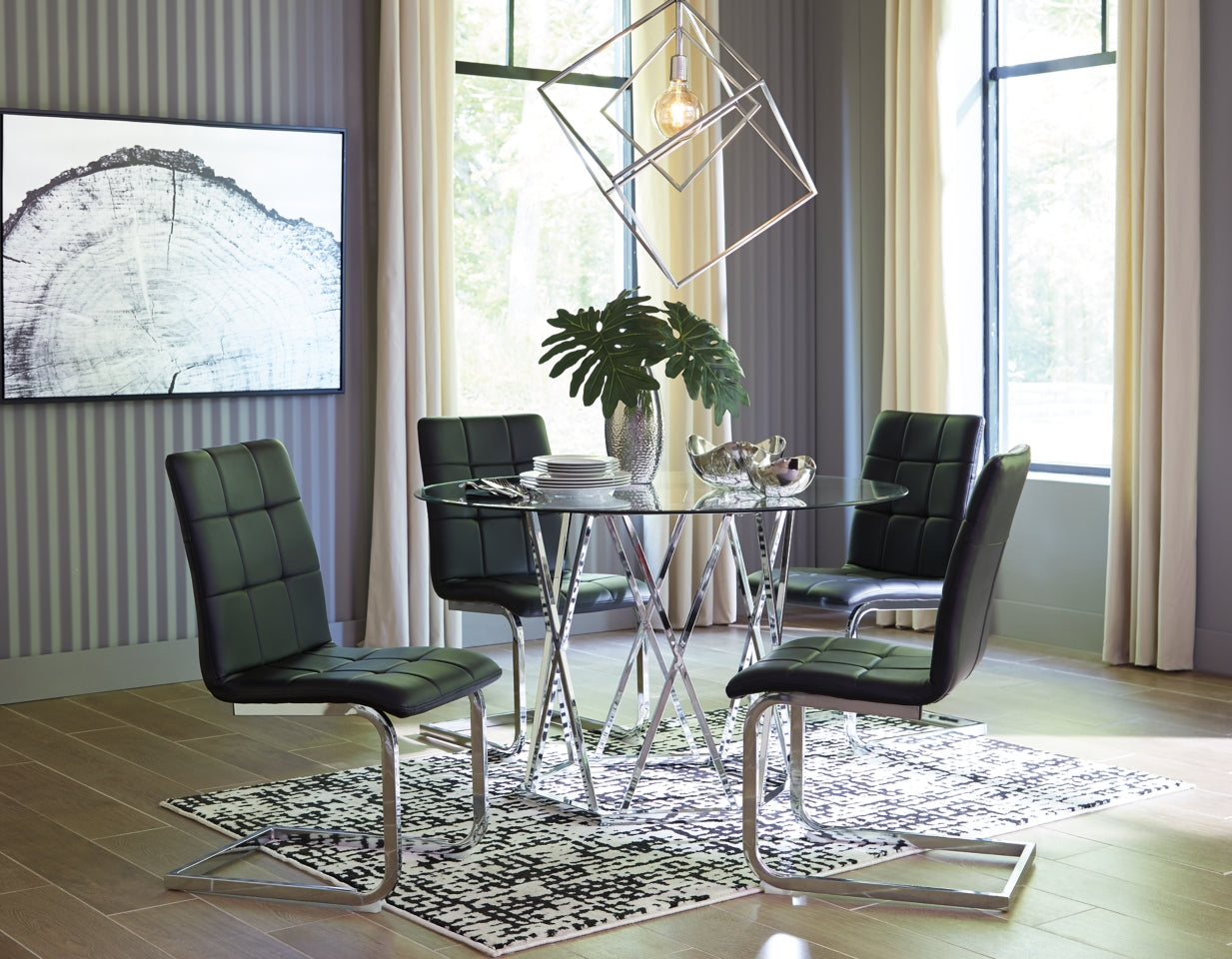 Wowing with an open and airy but sturdy profile, this 5-piece dining room set is sure to whet your appetite for ultra-contemporary style. Sporting a chrome-tone finish for a high-sheen effect, the table’s hexagonal metal base is striking from every angle. Clear glass top rounds out the look with sheer simplicity. The chair’s sculptural C-frame design and comfortably contoured faux leather seat will have you lingering at the table long after the meal is done.