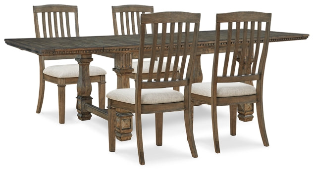 Curate a vintage-inspired retreat from the modern world. This dining package is draped in a dreamy finish with traditional styling. The profiled mouldings are complemented by contoured slat-back seat design and beige upholstery for a picturesque finishing touch.