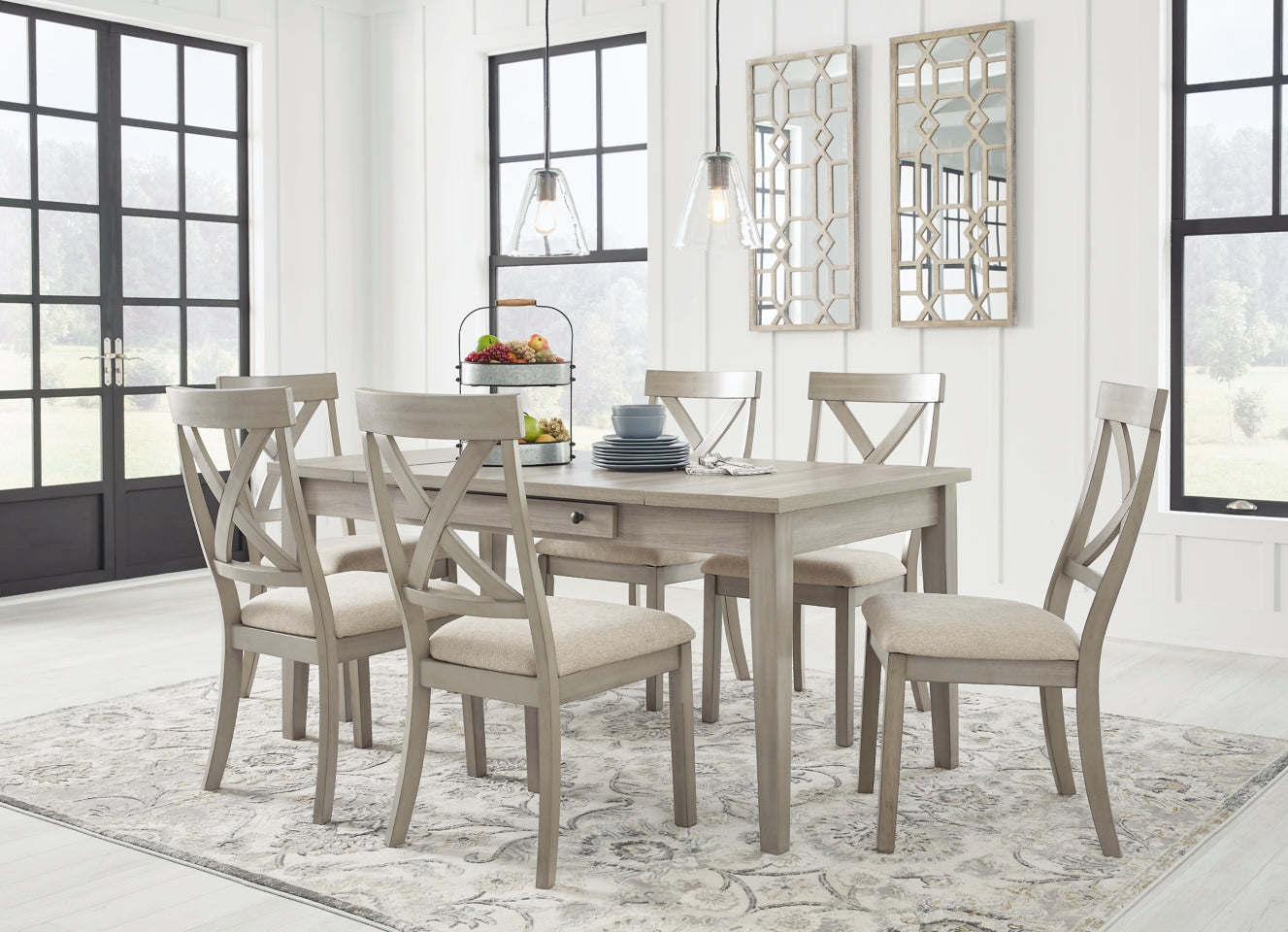 Bring a relaxed yet refined sense of good taste to a space with this casually cool dining package. Its clean-lined frames sport a gray finish that’s so easy on the eyes, making this set an inspired choice for modern farmhouse living.