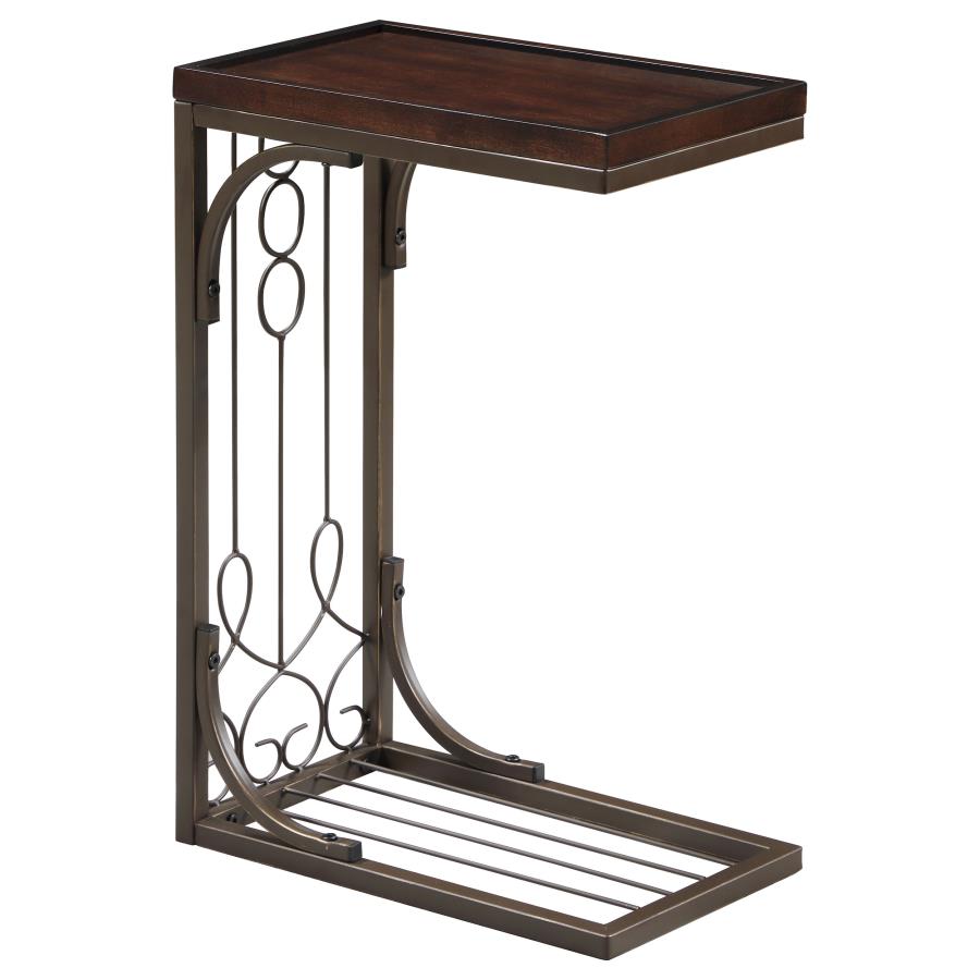 Elegance and convenience in one handy package. Designed to aid in serving guests, this snack table doubles as an end table and delivers portability with style. Ornate elements on its burnished copper finish base notch up the design factor and create a compelling look perfect for everyday use. A brown finish rectangular top hosts snacks, beverages, and even accent decor. Slide under a sofa or chair for direct service functions, or place alongside a seating ensemble as a permanent companion.