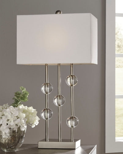 Bring an airy sophistication to your space with this modern lamp. Round crystal baubles give the effect of dewdrops poised on strands of silver. The understated geometry adds to the contemporary feel.
