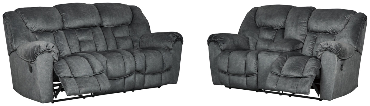 Sometimes seeing is believing. Rest assured this reclining sofa and loveseat set is every bit as indulgent as it looks. Designed to put you in the lap of luxury, this generously scaled reclining sofa and loveseat—wrapped in a wonderfully plush and practical granite gray upholstery—sport scooped pillow wrapped armrests and curvaceously cushioned head-neck support for feel-good flair.