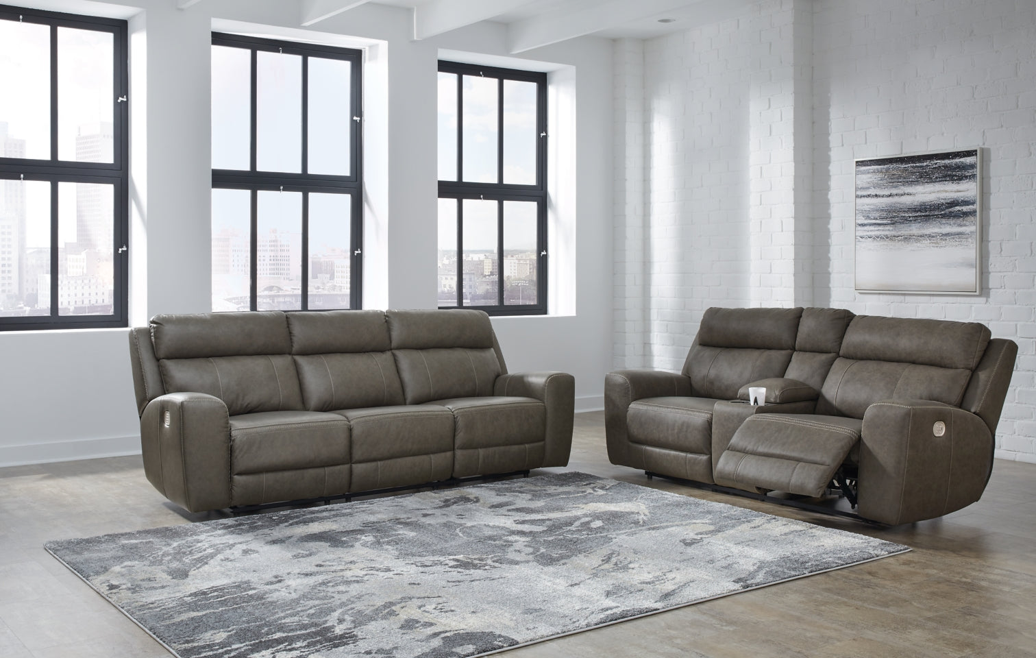 Stoic with its smoky hue, positively luxurious with real leather in the seating areas. This spacious power reclining package indulges you in contemporary comfort with one-touch power controls and adjustable headrests. Its upholstery elevates your aesthetic with an eye-catching crackle effect, simultaneously amplifying the large-scale silhouettes