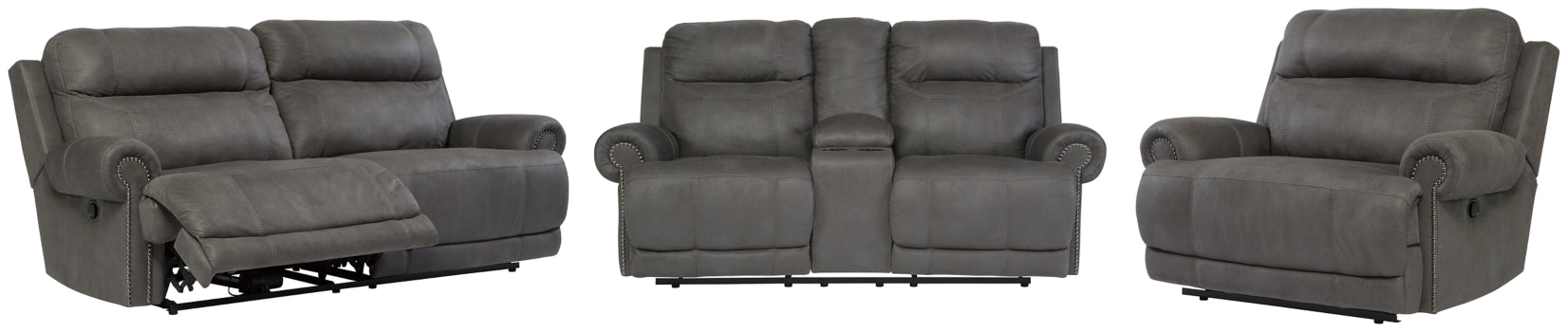 Sparing that "puffy" look you might expect from a recliner, this reclining sofa, loveseat and recliner set doesn't hold back when it comes to contemporary style. Subtle touches such as sporty jumbo stitching, nailhead trim and a "weather worn" effect on the upholstery give this handsome set a buttoned-up appeal and fresh feel. Loveseat’s center console with dual cup holders brings a handy element to the arrangement.