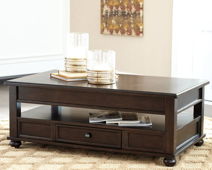 It's all about smart organization and keeping everything easily within reach with this traditional styled lift top coffee table. Its compact design is defined with the open middle shelf, lower drawer and hidden storage compartments found under the lift top. Because the top springs forward, this table can easily be accommodating for dinners in front of the TV or setting up a mobile workspace.