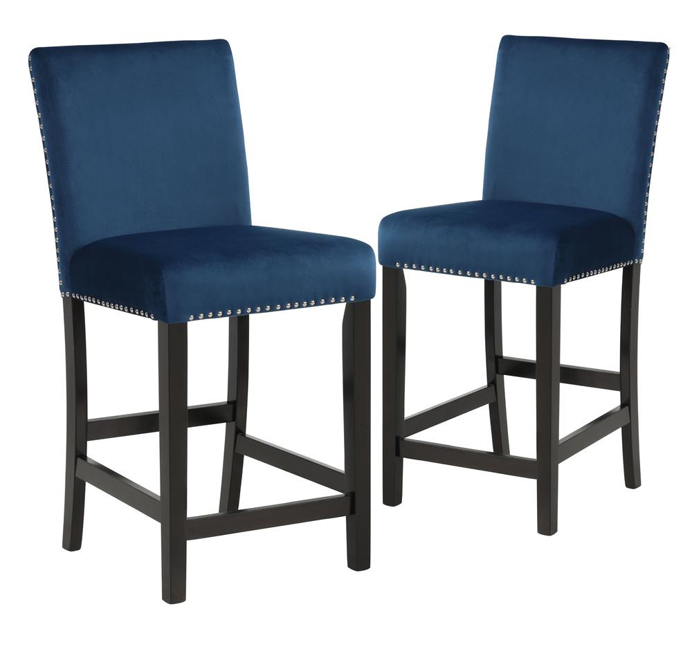 Introducing the New Classic Furniture Celeste Counter Dining Chair – a set of two chairs designed to combine style, comfort, and durability seamlessly. Crafted with solid Rubberwood legs and base stretchers that double as footrests, these counter chairs ensure a strong and stable seating solution for your elevated dining experience. The 100% polyester royal blue velvet upholstery covers sumptuous memory foam cushions, offering both softness and durability for an easy-care, luxurious seat. The espresso legs, paired with glimmering silver nailhead trim, add a touch of contemporary glamour to the plush velvet seating. Setting up these counter chairs is a hassle-free experience with the included easy-to-follow assembly instructions. Elevate your dining space with the Celeste Counter Dining Chair – where quality construction meets comfort and modern style effortlessly.