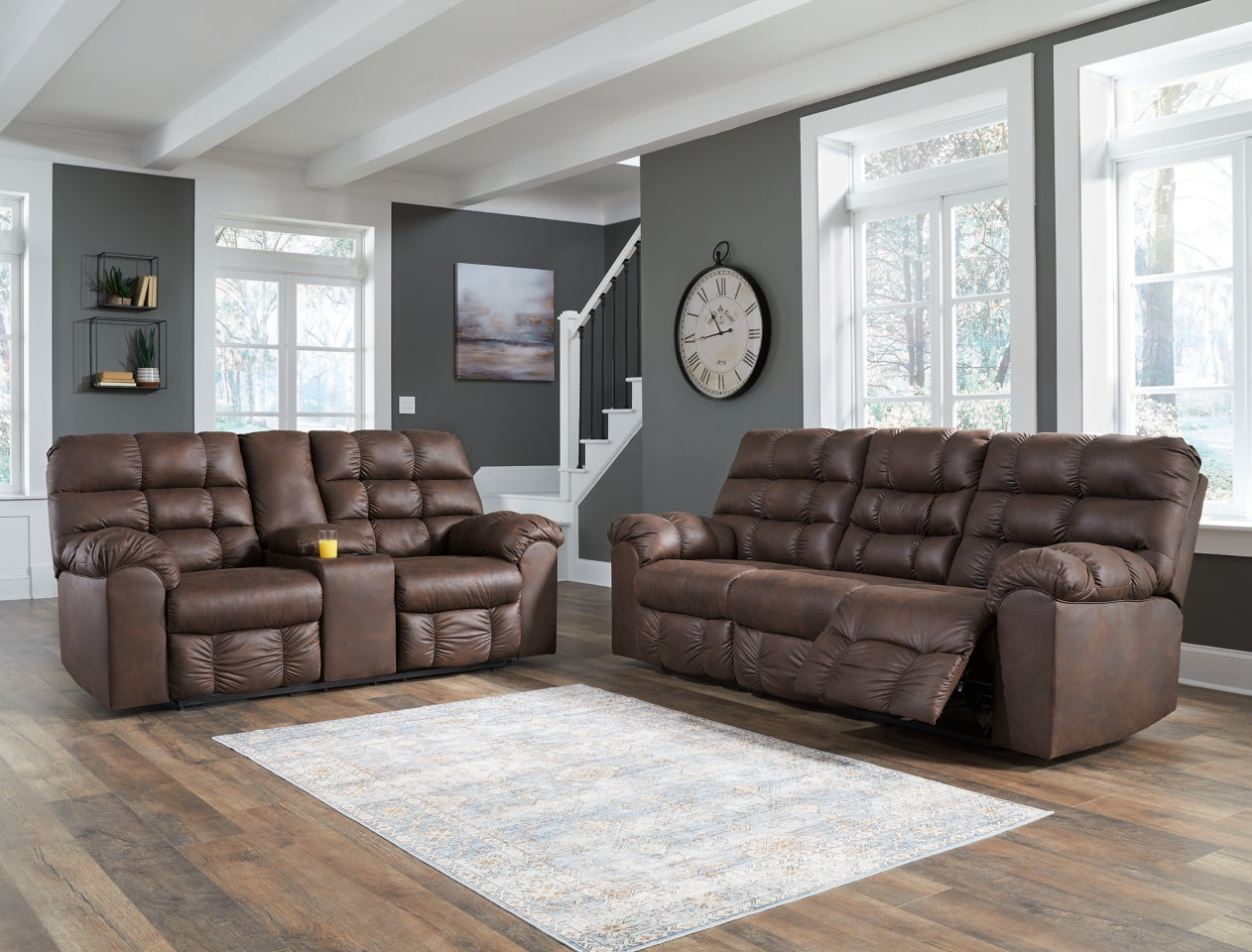 Rock the cool look of leather minus the hefty price tag with this reclining sofa and loveseat package. Rich with tonal variation, the faux leather upholstery sure looks like the real thing. And talk about indulgent comfort. Double stuffed armrests and sumptuous cushions cradle and support in all the right places. A distinctive biscuit back design enhances the set's contemporary flair, while the center console and drop down table with handy cup holders complete the experience.