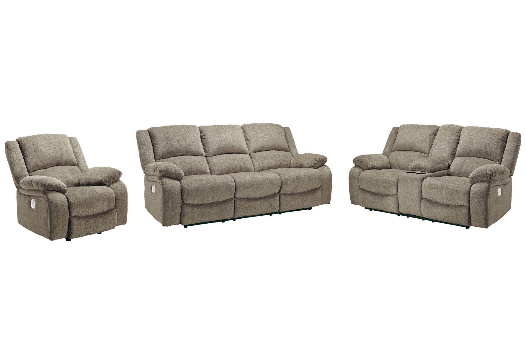 Built for luxury, this power reclining sofa, loveseat and rocker recliner combo lets you kick back in reliable style. The thick, softly textured chenille upholstery provides a comfy surface on which to lounge. With bustle back construction and thickly cushioned armrests, this set gives you the dependable support you need to unwind while handy USB ports provide the power to keep your devices going.