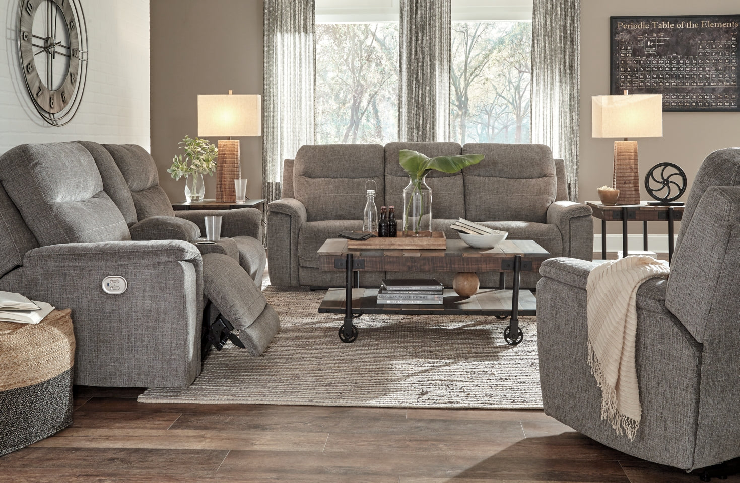 A modern addition to a great room, living room or family room, this power reclining sofa, loveseat and recliner in smoke gray lures with its smokin’ hot way to recline. Unique pad-wrapped armrests provide a cool aesthetic and pillowy softness. The velvety gray upholstery is sumptuously soft with deep channel tufting for clean-lined flair. With an Easy View™ power adjustable headrest that lets you fully recline and still have a primo view of the TV—plus a USB port in each power control—you truly have it all at your fingertips.