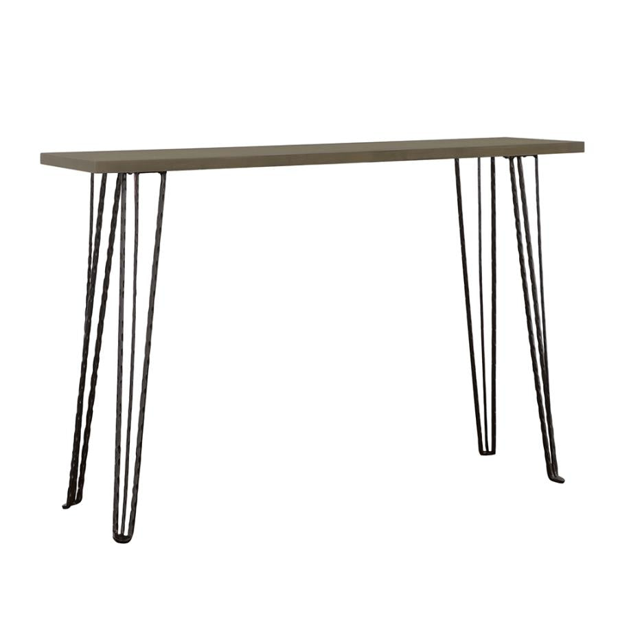 An elevated upgrade on industrial modern design, this console concrete table is sleek and clean. Constructed of wood, the table top showcases a rich hue that reveals an exposed wood grain. Deep and textured, the black hairpin legs add depth to hallways and entryways. Sleek and contemporary, the clean lines look great with a vase of fresh flowers and candles. This charming table adds a cozy feel while maintaining a clean and up-to-date feel.
