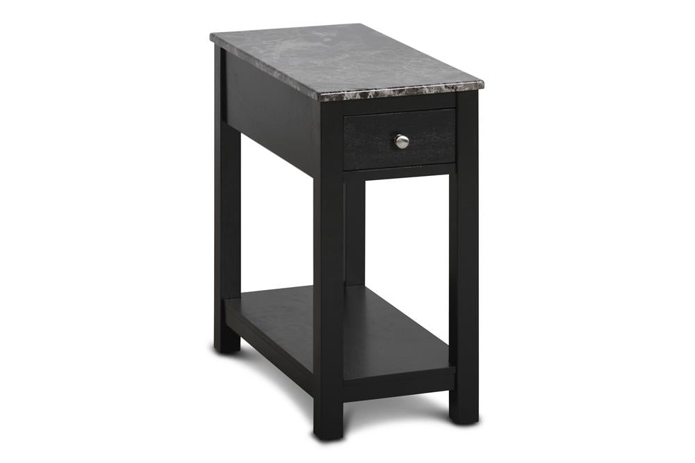 The New Classic Noah One Drawer Chairside End Table is crafted with durable solid Rubberwood and Okoume veneers, ensuring quality wood construction. The glossy coated faux marble top adds an elegant accent to your room while providing heat and water resistance for extra protection from wear. The rich espresso finish and brown marble finished top give this end tables a versatile style that blends well into both modern and traditional spaces. With a convenient base shelf and a smooth rolling drawer, this end table offers handy storage for remotes, books, and more. The slim 12-inch width makes it small space-friendly, fitting easily into compact spaces and supplying function wherever you need it. Assembly is easy with all instructions and tools provided for quick setup. Add a touch of style to your home with the Noah Chairside Table.