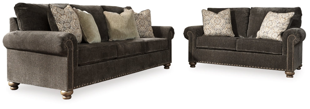 Everyone can have the best seat in the house with this sofa and loveseat set. Nailhead trim puts the finishing touches on the traditional roll arms you love. Reversible seat cushions with high-pile chenille fabric keep your sofa feeling plush. Textured velvet and European-influenced jacquard pillows add another layer of comfort. Turned feet in a burnished light brown finish show that style and quality flow from top to bottom.