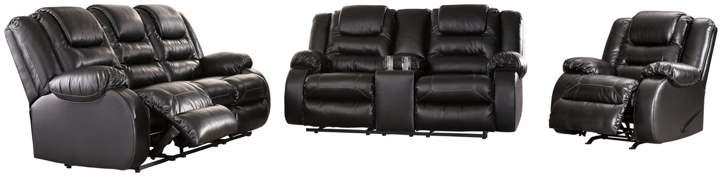 When it comes to comfort, style and value, this faux leather living room set with reclining sofa, reclining loveseat and rocker recliner in black rocks. Tailored for feel-good flair, its fashion-forward bustle back design is enhanced with sculpted padding on the headrest for cradling support. Channel cushioning along the sides flows into thick, wrapped pillowtop armrests that are truly over the top. And while it might look like you broke the bank, a sumptuously soft leather-like fabric keeps indulgence well within budget.