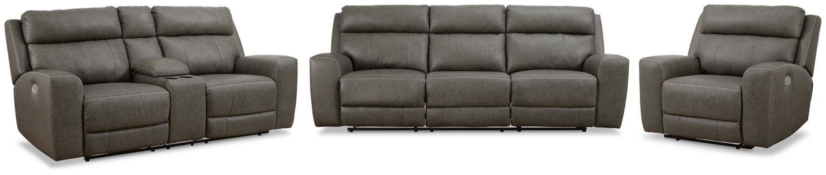 Stoic with its smoky hue, positively luxurious with real leather in the seating areas. This spacious power reclining package indulges you in contemporary comfort with one-touch power controls and adjustable headrests. Its upholstery elevates your aesthetic with an eye-catching crackle effect, simultaneously amplifying the large-scale silhouettes