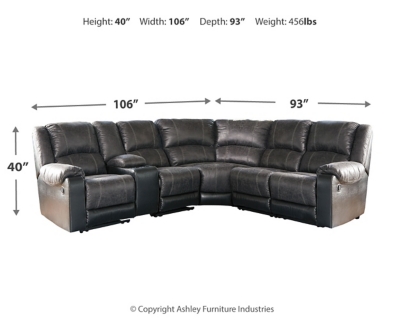 Sporting the look of perfectly "broken-in" leather, this faux leather sectional has it all: looks, comfort and value. Its combination of weathered slate gray and black faux leather upholstery adds a nice contrasting element to the plump cushions, while jumbo stitching enhances the fashionable flair. Clean and simple divided back tailoring keeps this roomy sectional’s aesthetic cool and contemporary.