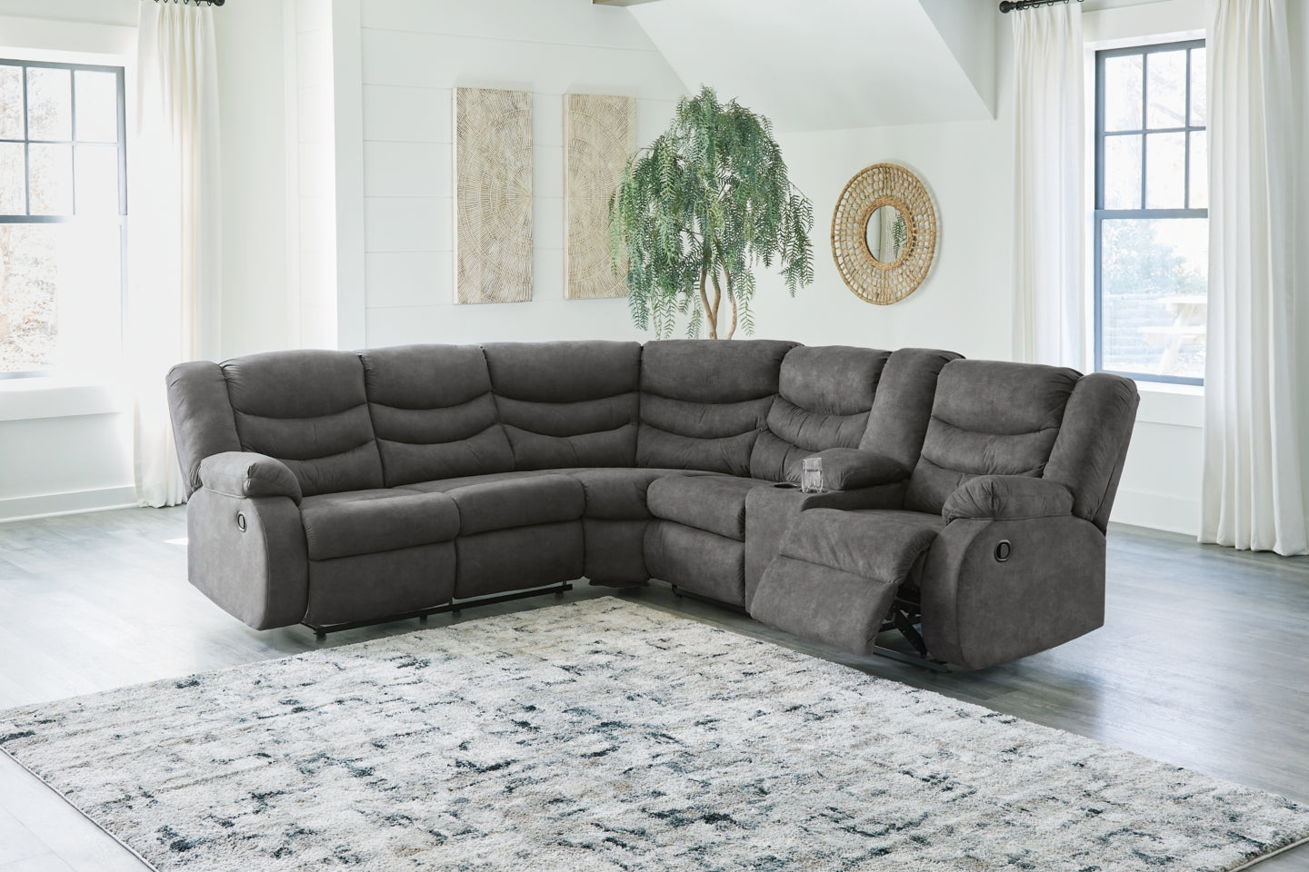 Affordable luxury made easy. An essential for living room lounging, this sectional is a star in social spaces. Its sleek slate gray faux leather is well-suited for mixing and matching with your existing pieces. Pull tab reclining keeps you and your companions covered when it comes to comfort. And this functional piece is equally as fashionable, with design details like a channel-stitched back incorporating subtle visual interest.