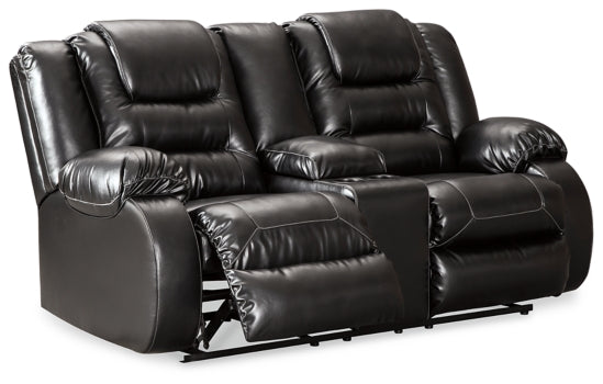When it comes to comfort, style and value, this faux leather reclining loveseat in black rocks. Tailored for feel-good flair, its fashion-forward bustle back design is enhanced with sculpted padding on the headrest for cradling support. Channel cushioning along the sides flows into thick, wrapped pillowtop armrests that are truly over the top. And while it might look like you broke the bank, a sumptuously soft leather-like fabric keeps indulgence well within budget.