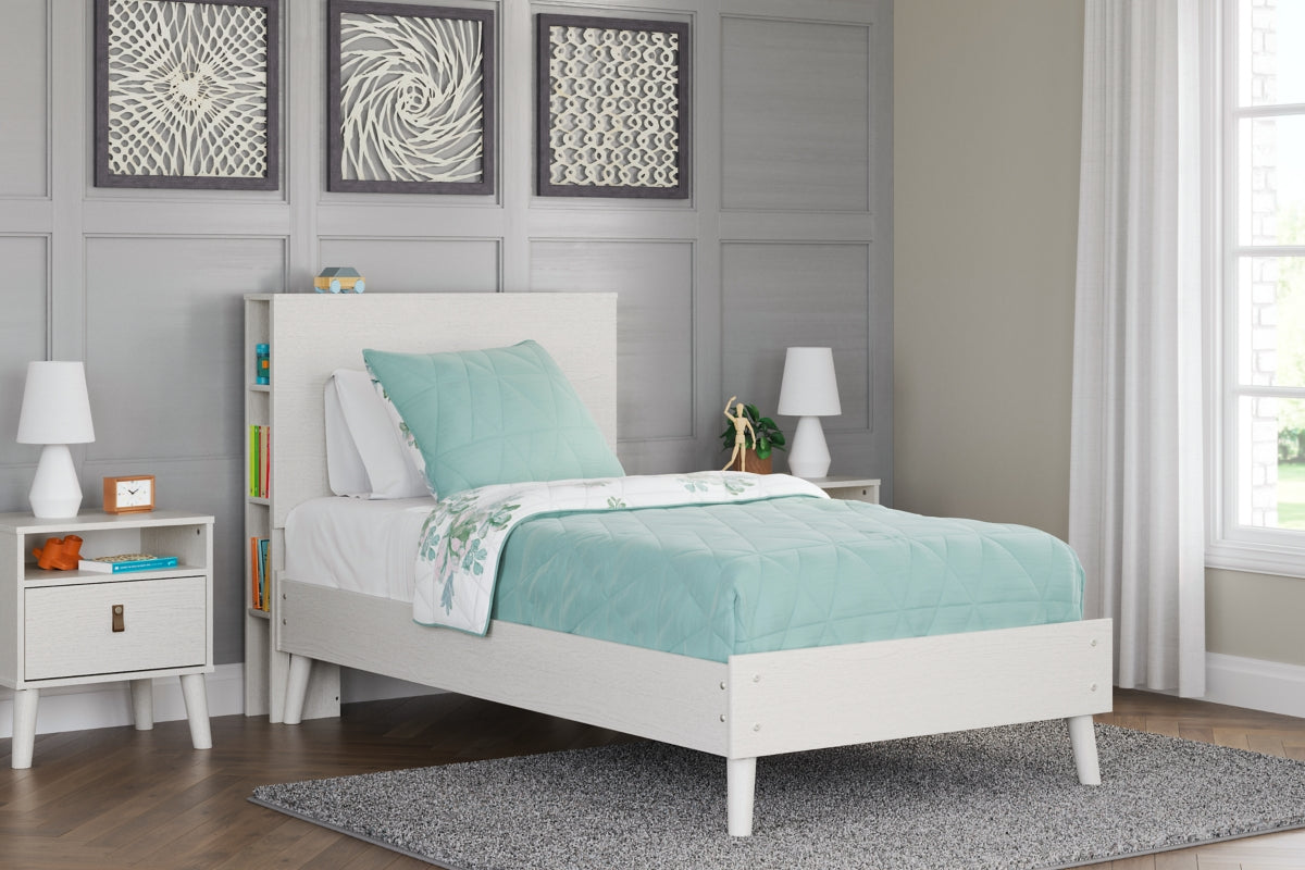 Dare to take minimalism to the max. This twin bookcase bed has an air of sleek simplicity thanks to its white painted finish with subtle replicated wood grain. A space-efficient storage option, cubbies along the side of the headboard ensure you can keep your favorite reads within reach. USB charging keeps up with your high-tech lifestyle. There's no doubt about it: This contemporary piece is sure to become a classic.
