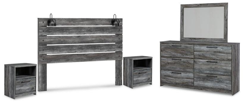 Baystorm King Panel Headboard with Mirrored Dresser and 2 Nightstands