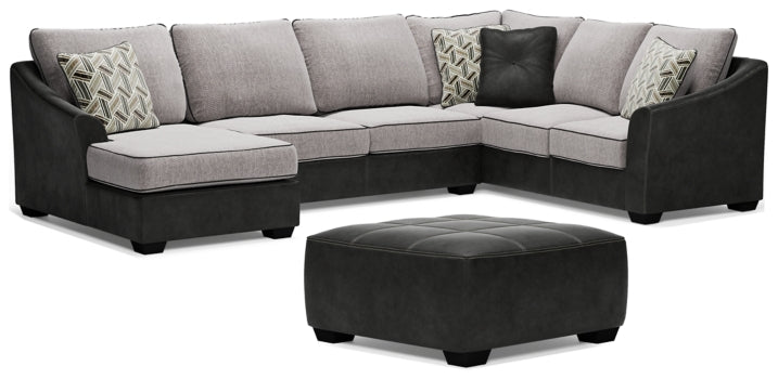 Double your pleasure with this cool and contemporary upholstery package that distinguishes itself with dual fabric treatment. Feel-good herringbone weave upholstery is outlined with pretty piping, while faux leather adds a fashion-forward twist. Sloped flared armrests and abstract-patterned pillows perfect the aesthetic.