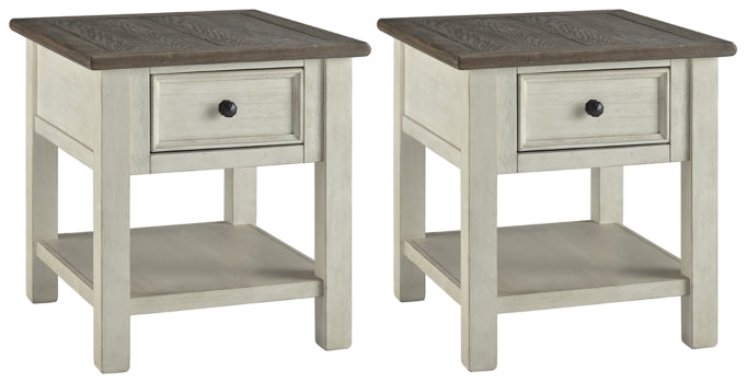 Whether your style is farmhouse fresh, shabby chic or country cottage, you’ll find the Bolanburg 2-piece end table set dressed to impress. Its two-tone, gently distressed finish pairs weathered oak with antique white for that much more quaint character. Charming elements include a plank-and-frame style top, black faceted hardware and smooth-gliding drawer storage for remote controls and more.