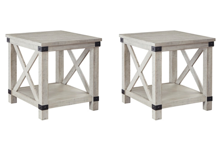 Sporting a distressed whitewash finish, this end table set is rustic farmhouse living at its best. Crossbuck styling adds striking flair. Metal industrial brackets incorporate an industrial twist.