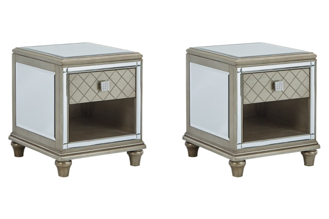 Glamorous, chic and sophisticated. This accent table set is made of solid wood with a metallic silvertone finish, with inset beveled mirror panels and inset drawer pulls adorned with faux crystals. This set is a stunning addition to your contemporary decor.
