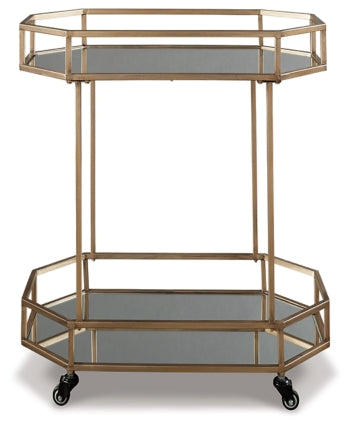 This bar cart entices with high glam appeal that knows how to strike a stylish pose. Mirrored shelves are a trendy complement to the goldtone finished metal. Its open concept frame has plenty of chic panache to accompany drinks and glassware. Convenient caster wheels make transport a breeze.