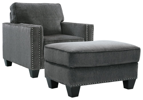 Time to go gray? Find your fill of comfort, style and sophistication in this chair and ottoman combo. Its smoky gray upholstery is sumptuously soft to the touch and beautifully on trend. Ultra clean lines punctuated with black nickel-tone nailhead trim give this gorgeous gray set a cool, contemporary edge.