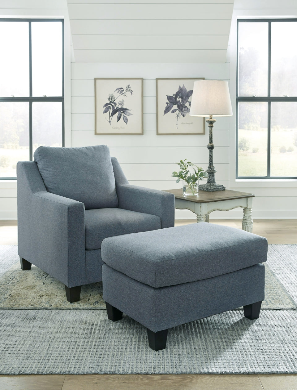 Sporting a clean and uncluttered aesthetic, this chair and ottoman package is a lovely choice in contemporary furniture. Elements include slim track arms with angled flair, sleek tapered feet, and a feel-good flatwoven twilight blue upholstery that’s a refreshing change from the everyday ordinary.