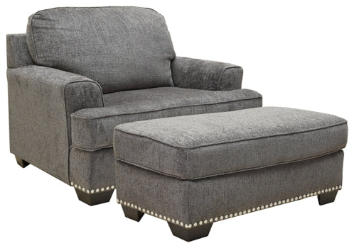 There’s no doubt this oversized chair and ottoman make a trendsetting first impression. The textural chenille fabric elevates the look of your room with its handsome gray hue. Pewter-tone nailhead trim brings an element of shine. Prop up the fashionable throw pillows or curl up with them as you get comfortable. The set's oversized scale with deep seating will give you plenty of comfort and relaxation.
