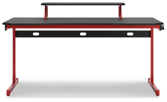 Work smarter (and look cool doing it) with the new-age efficiency of this home office desk. Its streamlined design is ideal for gaming or as a general workstation. The super-sleek yet fully-loaded home office desk has a tech-inspired surface and raised monitor stand for ultimate style and efficiency. Its fantastic features also include a headset hanger conveniently mounted on the side, as well as a raceway tucked underneath for managing all your cords.