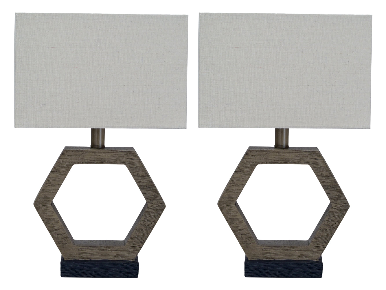 Who knew geometry could be so stylish? This table lamp set's hexagonal base sports a stunning gray-washed finish over faux wood. Angular silhouette brightens up your space with the right amount of style and light.