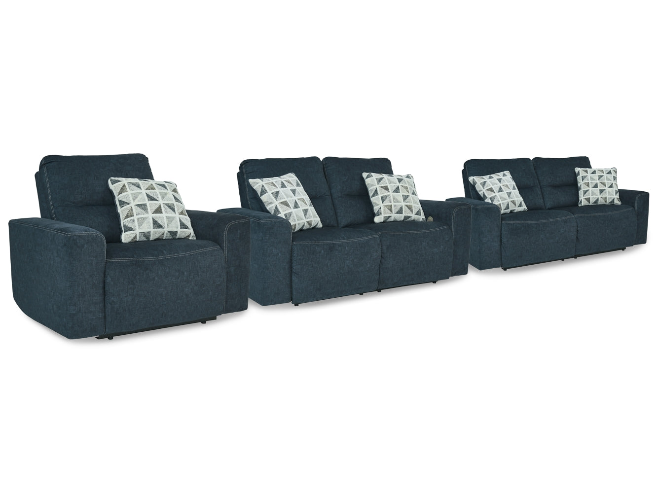This power reclining seating package does the work for you as you sit back, relax and kick up your feet. It features a timeless two-over-two cushion design, wide track arms and irresistibly soft velvety blue upholstery. Contrast stitching and tufted details offer a modern look that is always in style. Geometric accent pillows add a splash of color.