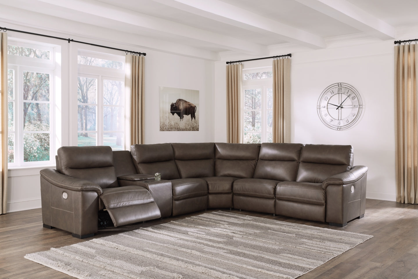 Easy on the eyes and incredibly comfortable, this high-end power reclining sectional will upgrade the look and feel of your living room. Its automotive-inspired leather and faux leather keep luxury right on budget. This sectional is just the right touch for reclining and relaxing in style.