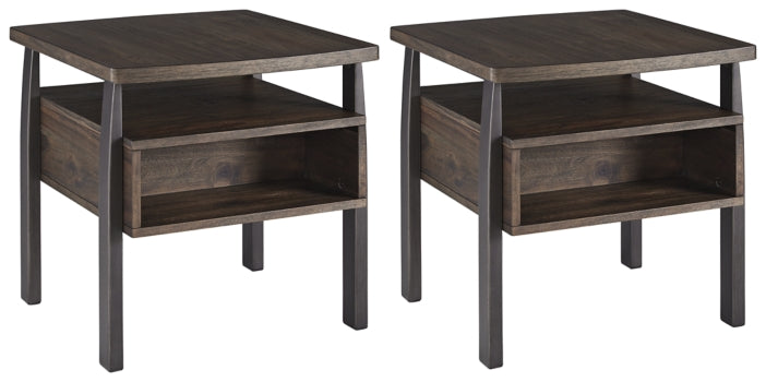 This 2-piece end table set opens our eyes to the beauty of contemporary style with a rustic attitude. Its clean-lined, open-concept design is dressed to impress with a two-tone finish that blends a grayish brown wire-brushed effect with a contrasting faux metal color.