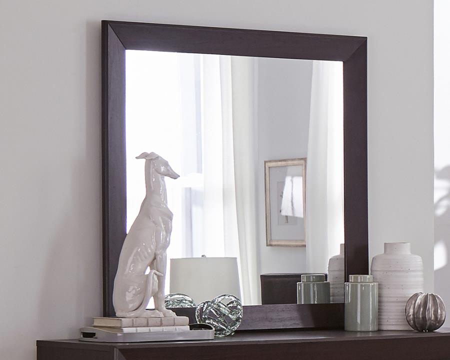 Transitional and versatile, this five-piece bedroom set is mid-century modern-inspired. Including a bed frame, nightstand, dresser, chest and mirror, this set is complete with block tapered legs. The sleek silhouette of the bed frame is upholstered in brown leatherette fabric with decorative stitching. Warm up a contemporary space with the rich hue of the wood and the deep metallic hardware. Contrast black recessed grooves create a framed feel, full of sophistication.