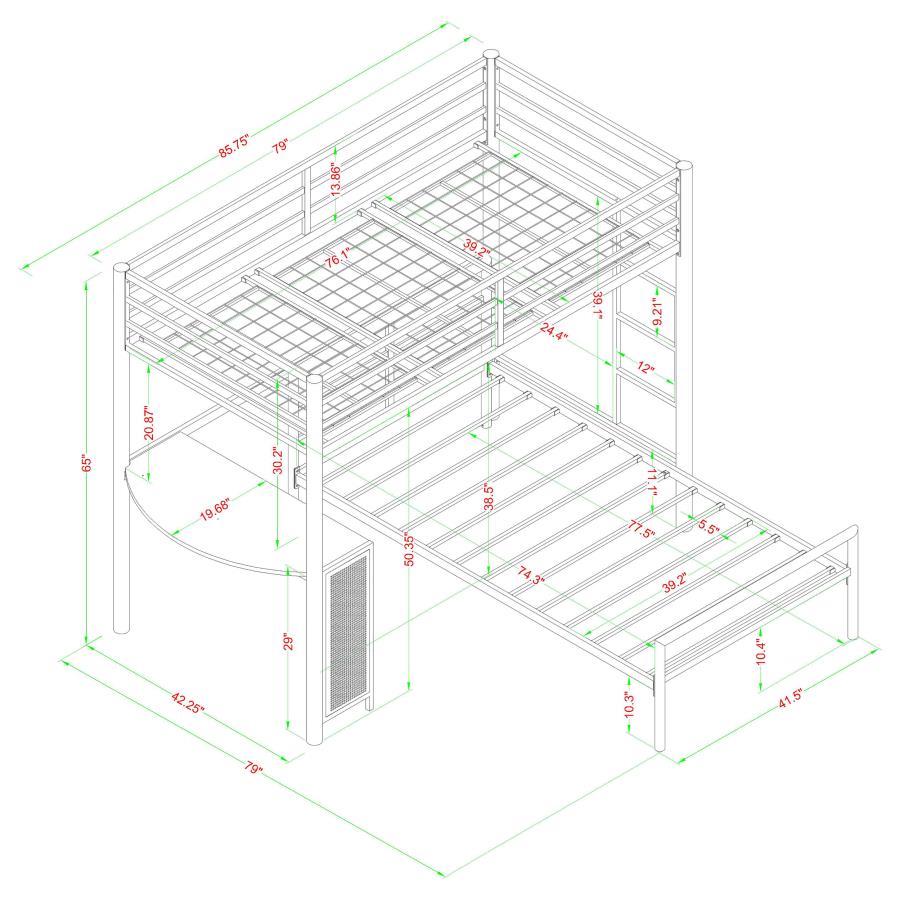 Every school-age child is over the moon to have a workstation loft bed in their room. The sleek gunmetal finish makes us an easy addition to contemporary sleeping spaces. The bottom area of the loft workstation serves as a study space, equipped with a shelf to hold a laptop and books. Your child can easily access the top bunk by using the secure attached ladder. It's easy to snooze soundly on the top bunk, which is safely constructed with guardrails for your peace of mind. A separate twin size bed underneath the loft allows for convenient sleep space for siblings or guests. Set includes 460229 twin loft bed and 300279T twin bed.