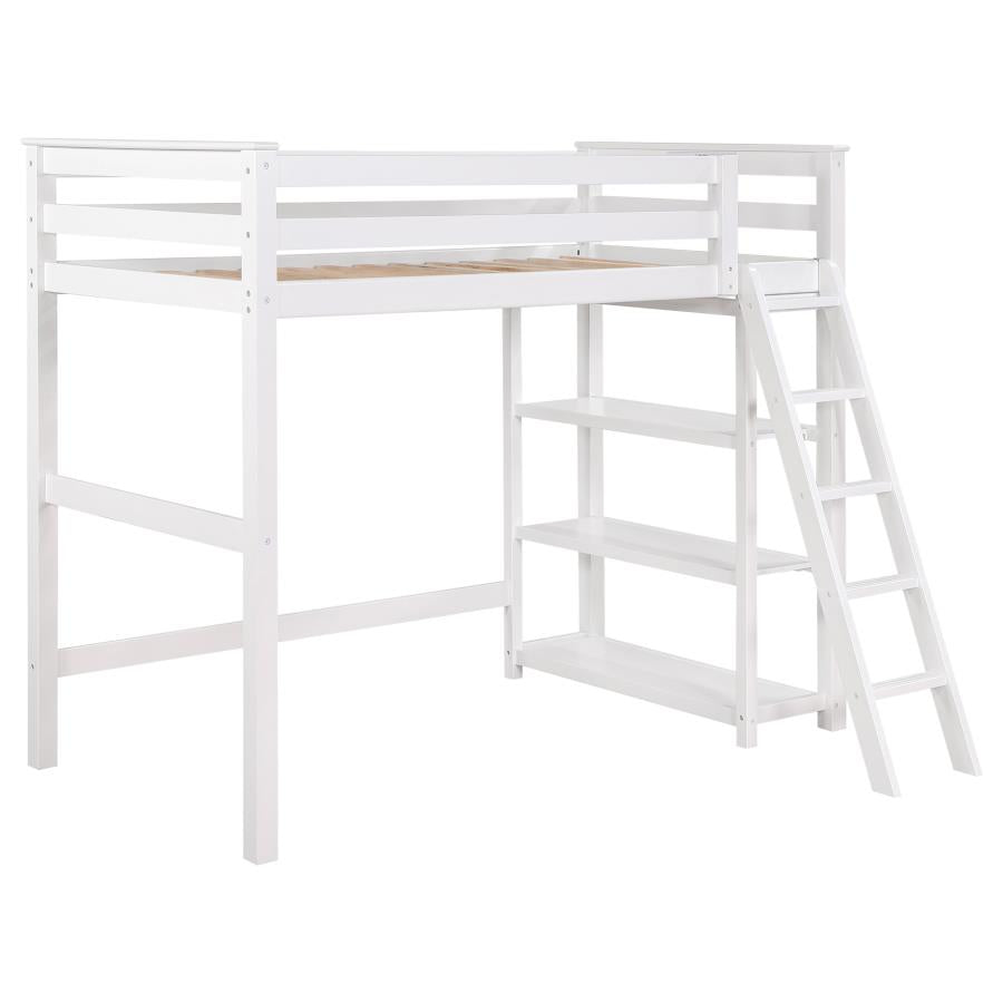 Turn your child’s or teen’s bedroom into a center of organization with this twin size workstation loft bed. Expanding on the space-saving features of a bunk bed, this unit creates an entire sub-space for sleeping, studying, and reading. Plywood and melamine laminate creates a lightweight yet sturdy design, beginning with a top loft bed protected by horizontal guardrails. A side ladder adds easy bed access, as an open space under its bed and side shelving makes room for a desk, bean bag, books, and supplies. Save room in a smaller bedroom, or double up to accommodate two of these chic beds in one room.