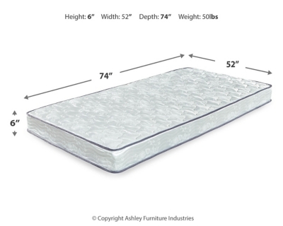 This budget-friendly firm full mattress offers a comfortable night’s sleep at a comfortably affordable price. At the core of this mattress: 13.5-gauge tempered Bonnell steel coils that provide maximum support for a sound sleep. The mattress’ quality foam and quilted polyester fabric add an enhanced level of comfort. Foundation available, sold separately.