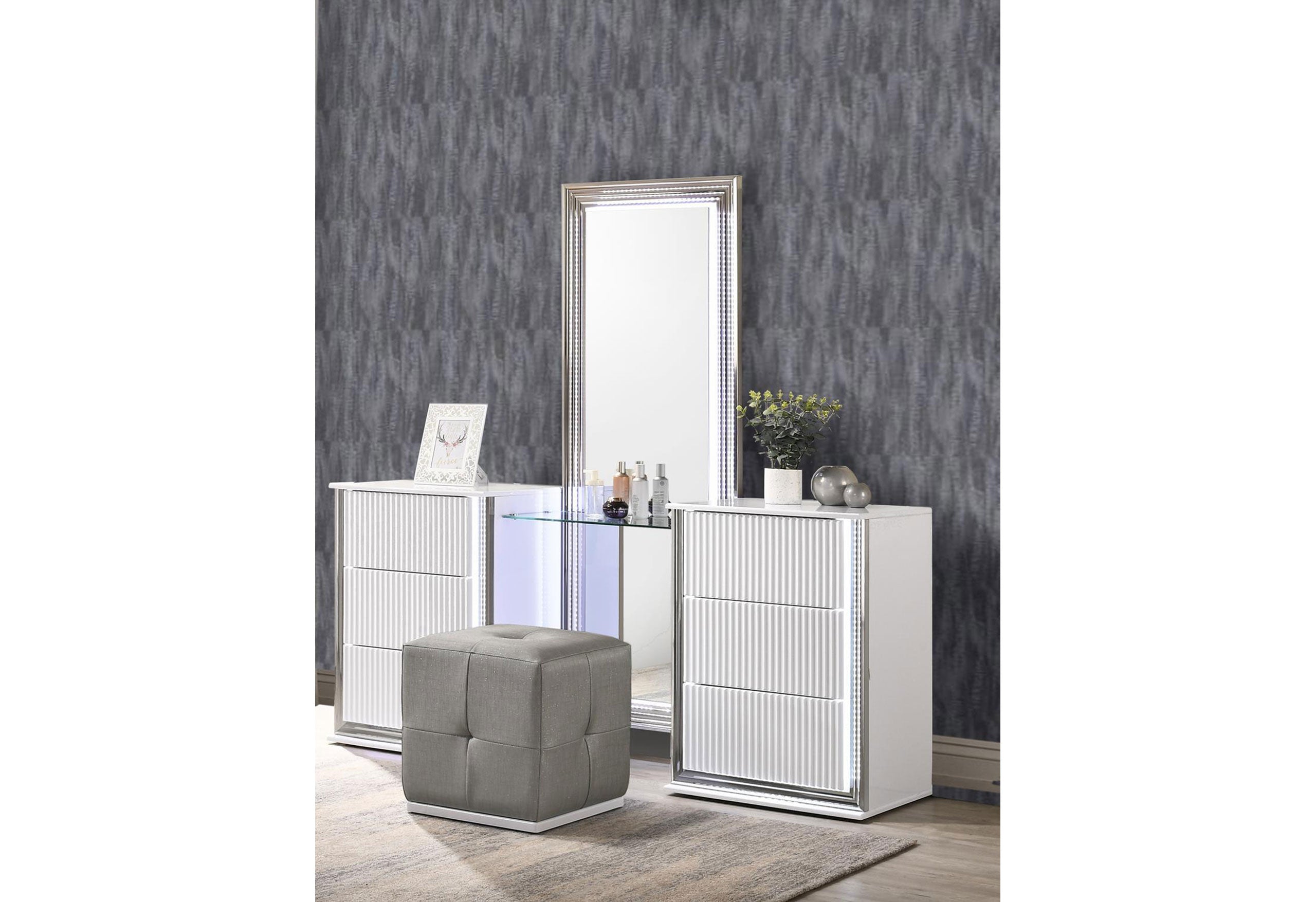 Global Furniture USA’s Aspen Collection features modern and sophisticated styling and LED lighting. The bed ensures comfortable sleep, while the case pieces provide ample storage space. The available vanity is equipped with spacious drawers and a large mirror, making it convenient for morning routines. The LED lighting adds a serene touch, ideal for unwinding and relaxing after a busy day.