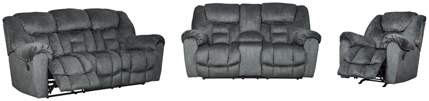 Sometimes seeing is believing. Rest assured this reclining sofa, loveseat and rocker recliner set is every bit as indulgent as it looks. Designed to put you in the lap of luxury, this generously scaled reclining sofa, loveseat and recliner—wrapped in a wonderfully plush and practical granite gray upholstery—sport scooped pillow wrapped armrests and curvaceously cushioned head-neck support for feel-good flair.