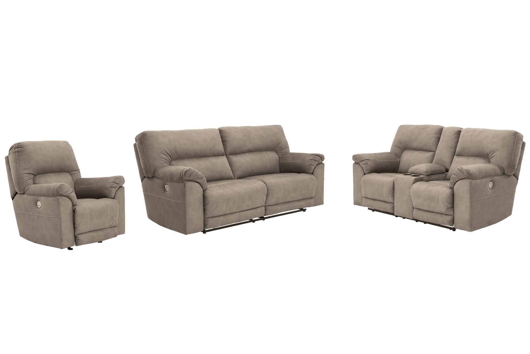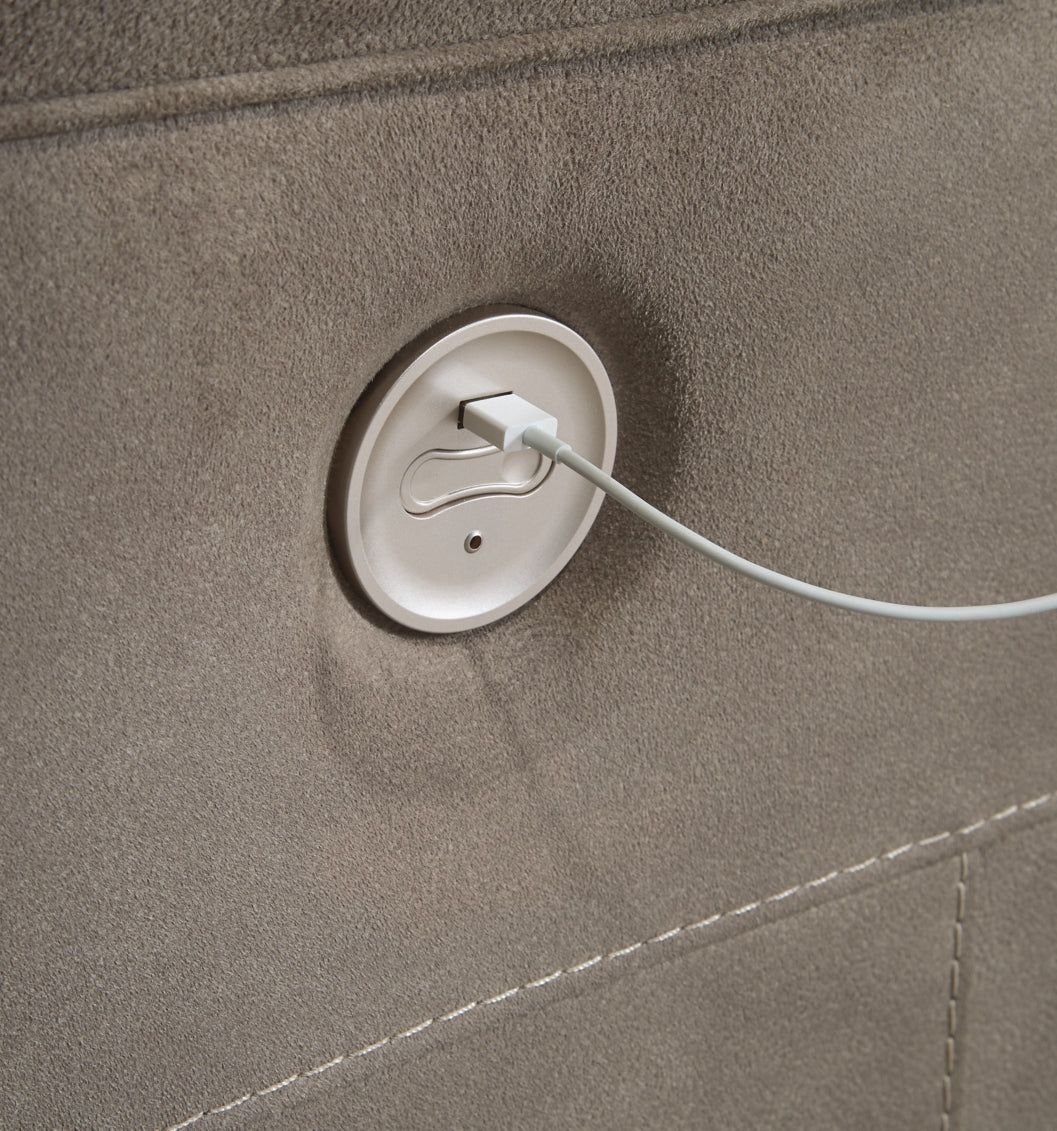 Strike a balance between the indulgent comfort you crave and the cool aesthetic you long for with this reclining power set. Offering the cool look of weathered leather, the feel-good slate-tone upholstery takes neutral to new heights. Simply chic tailoring, jumbo stitching and a USB port in the one-touch power control are among the finer details that make all the difference.