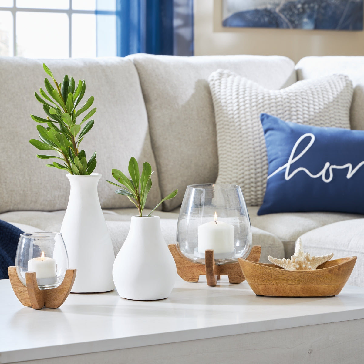With this 5-piece accessory set, you can easily create a table centerpiece. Its clear glass candle holders and white terra cotta vases are enhanced by the natural wood bowl and candle holder stands. Designed with shapely silhouettes, these pieces are perfectly sized for an end table or office desk. Due to the use of natural materials, some variations may occur.